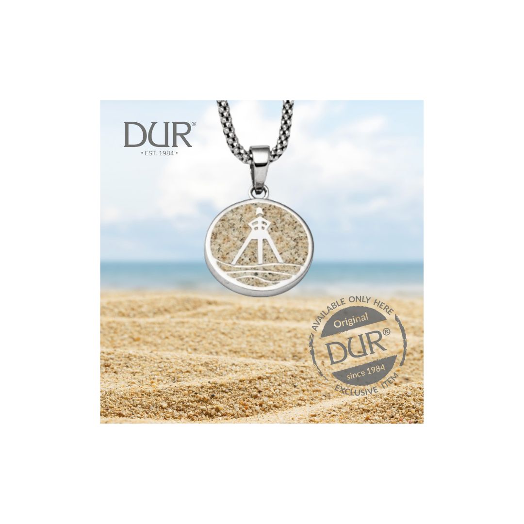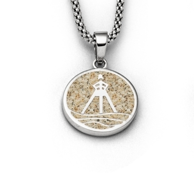 Ahoi "Løkken", lille rundt vedhæng med Løkken Sømærketåvand og bølger, indstøbt i strandsand og sat i rhodineret 925 sølv