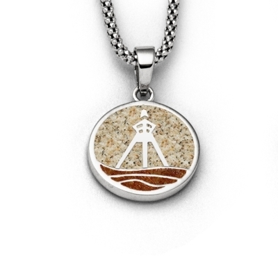 Ahoi "Løkken", lille rundt vedhæng med Løkken Sømærketåvand og bølger, indstøbt i strandsand og sat i rhodineret 925 sølv