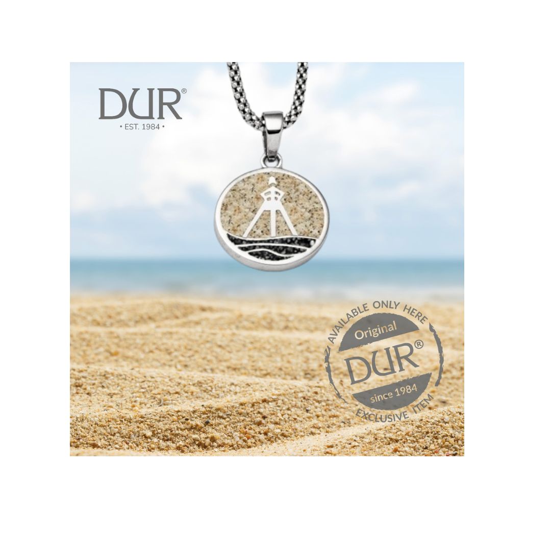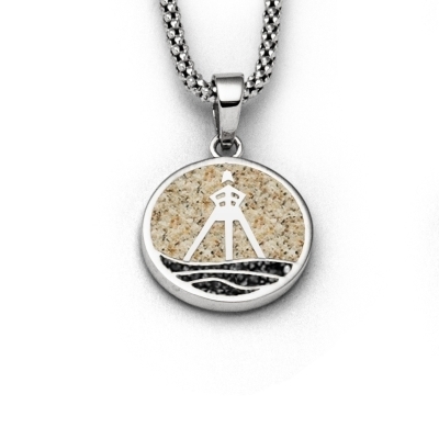 Ahoi "Løkken", lille rundt vedhæng med Løkken Sømærketåvand og bølger, indstøbt i strandsand og lavaand og sat i rhodineret 925 sølv