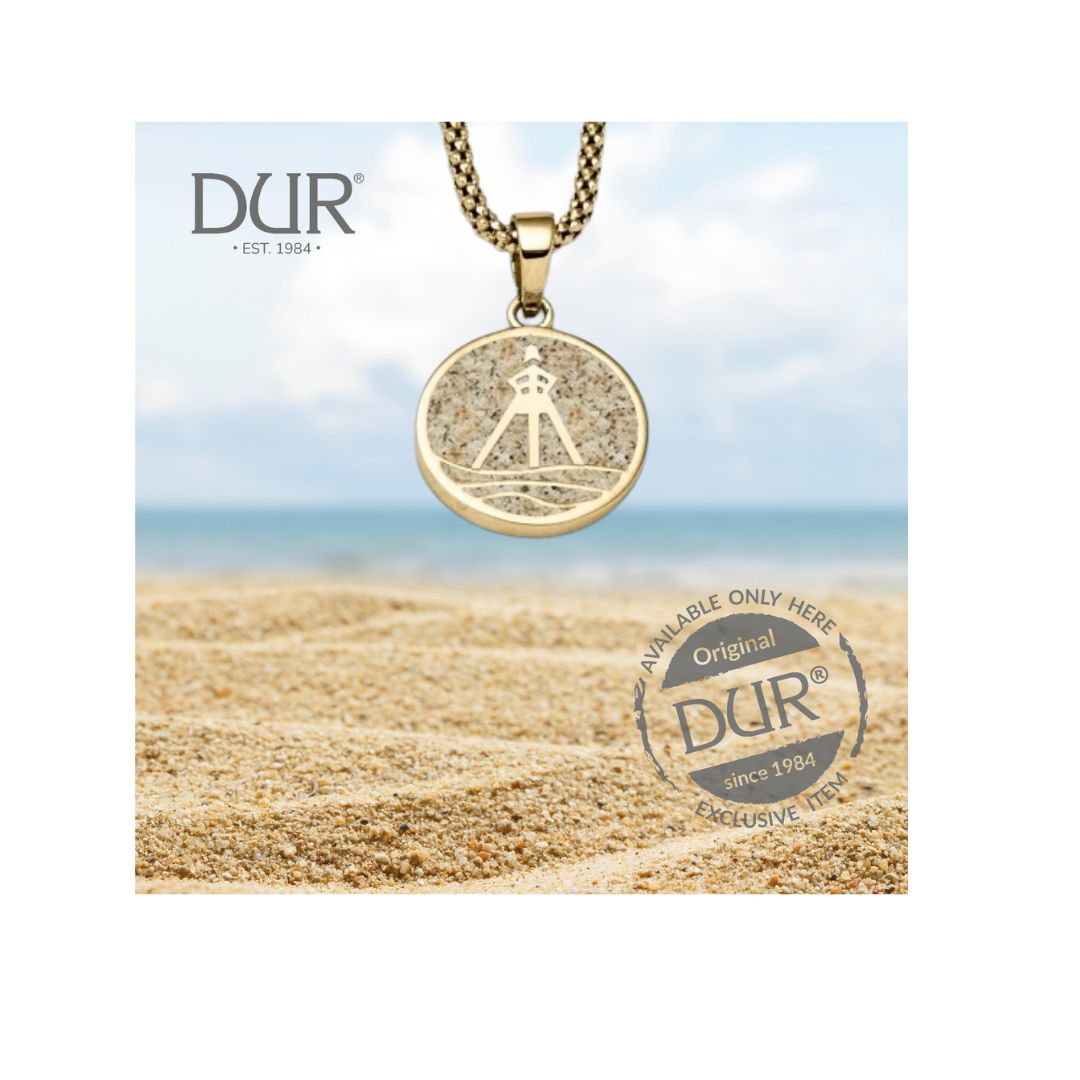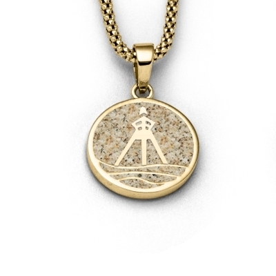 Ahoi "Løkken", lille rundt vedhæng med Løkken Sømærketåvand og bølger, indstøbt i strandsand sat i forgyldt rhodineret 925 sølv
