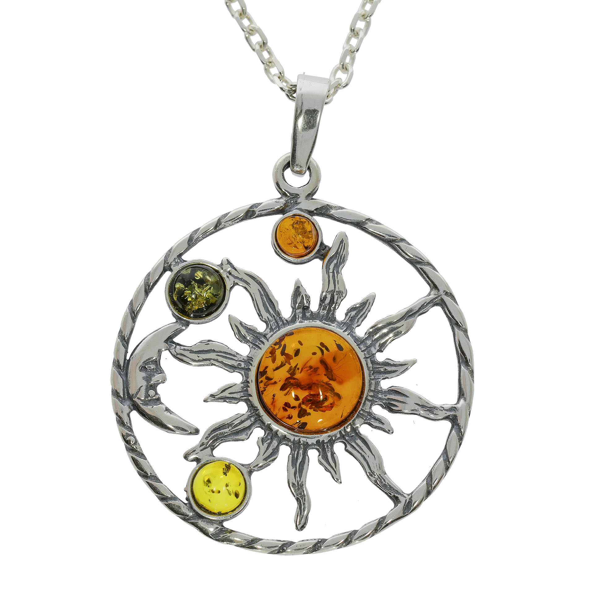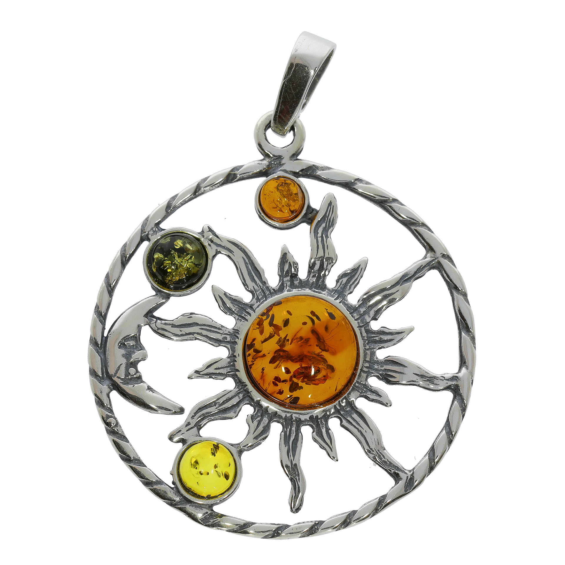 Sol og halvmåne himmelsk vedhæng | 925 sterlingsølv med flerfarvet rav