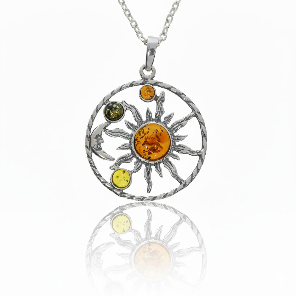 Fang harmonien i kosmos med denne smukke sol- og halvmåne-halskæde. Det cirkulære, åbne design har en strålende sol i midten, ledsaget af en yndefuld sølvhalvmåne og tre "planeter" af ægte flerfarvet rav.