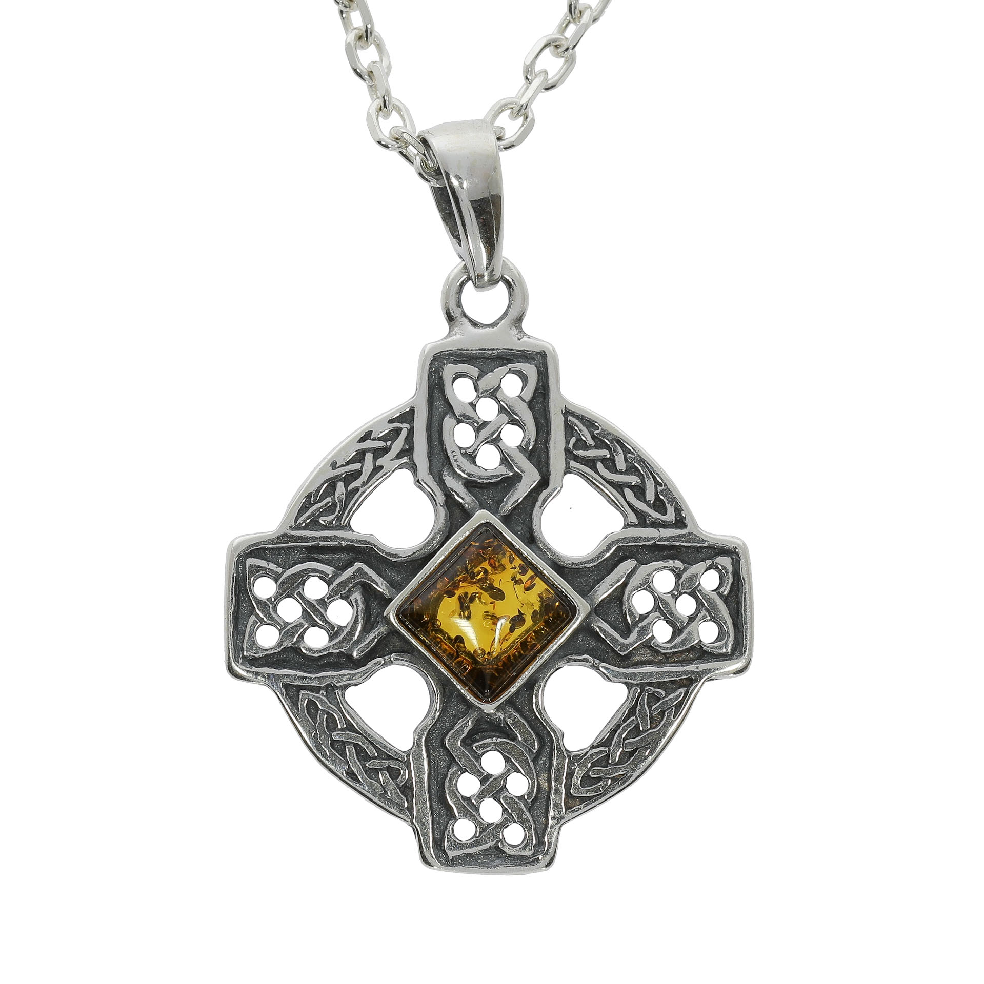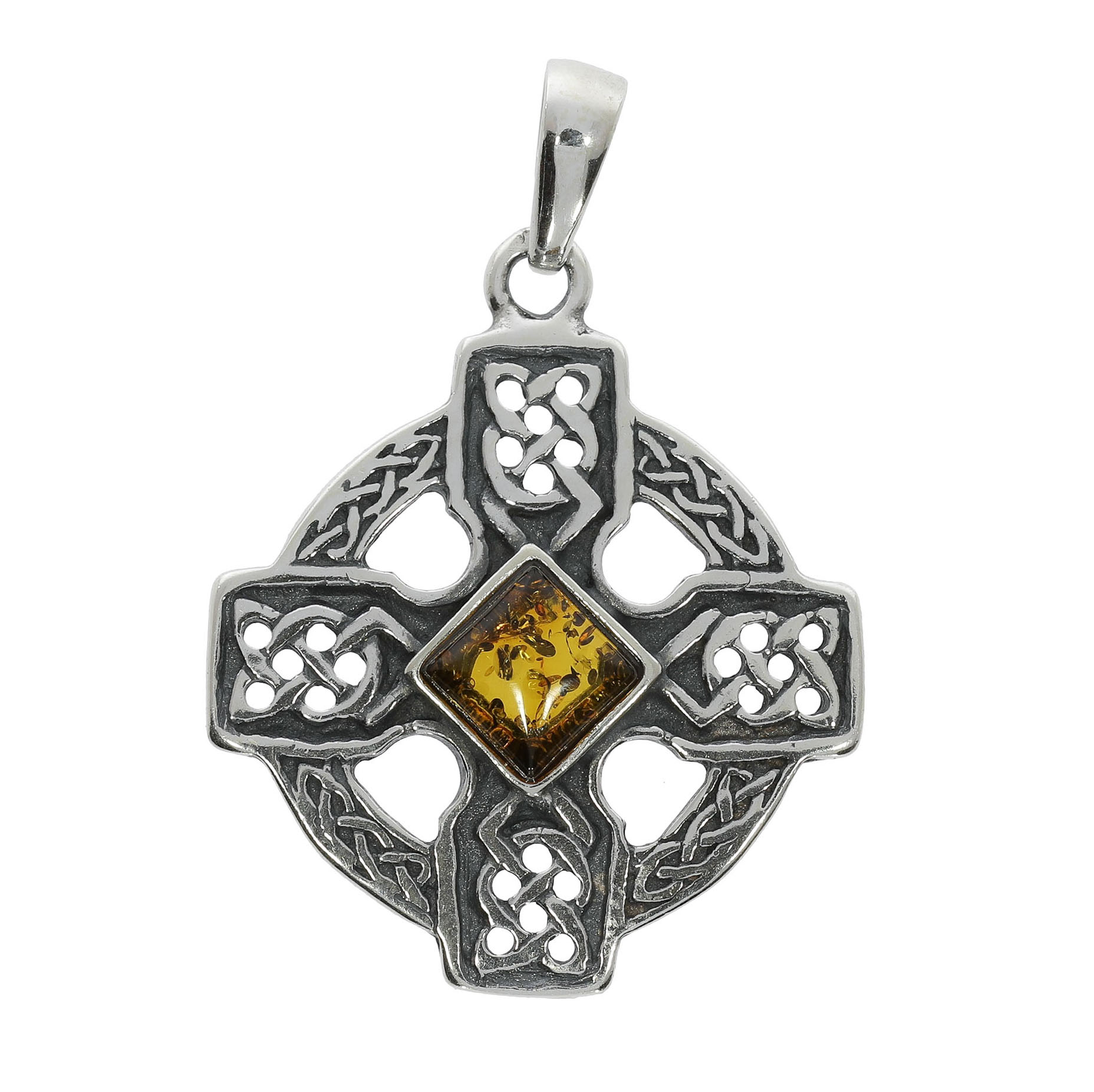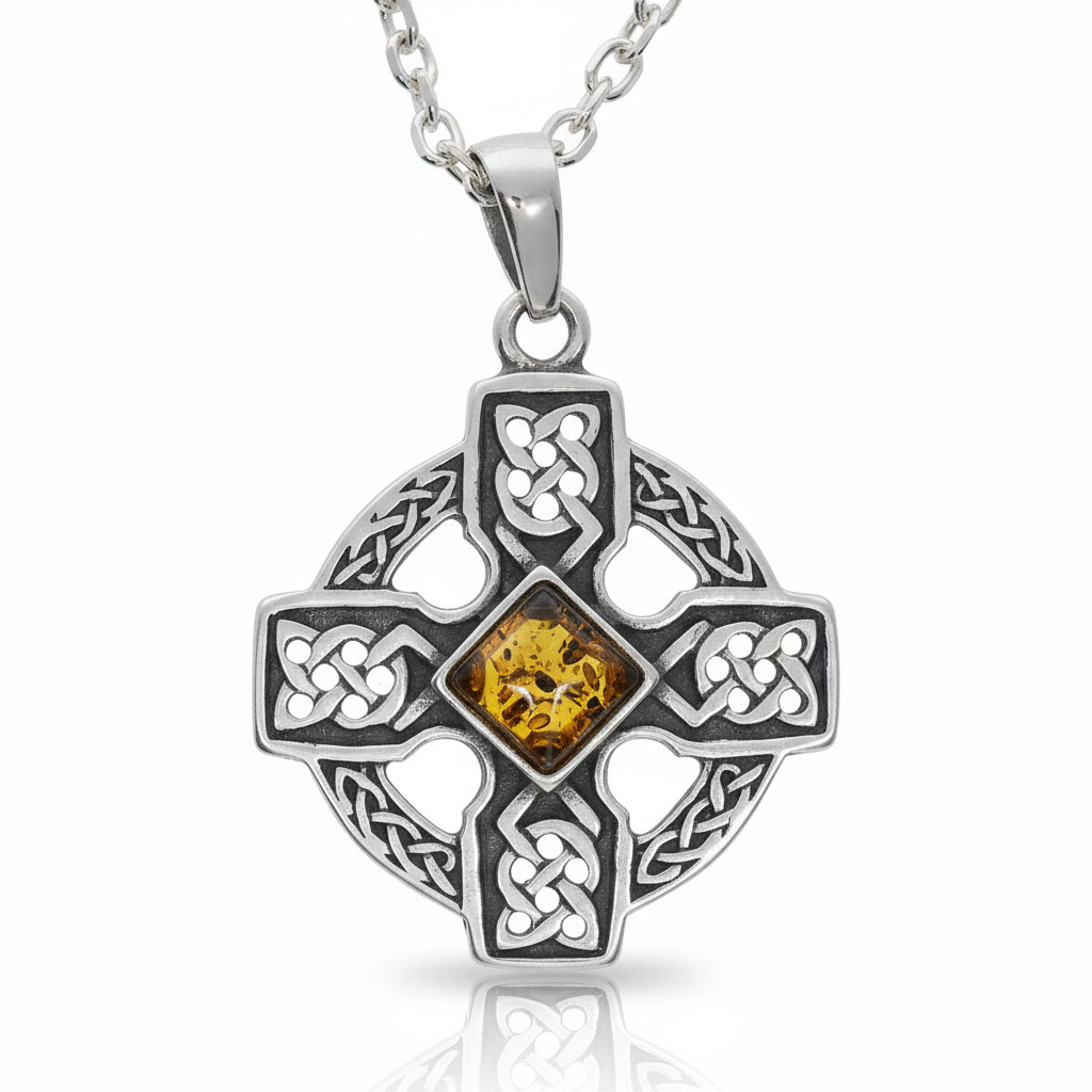 Keltisk højkorsvedhæng i 925 sterlingsølv | Firkantet cognacfarvet ægte rav i midten
