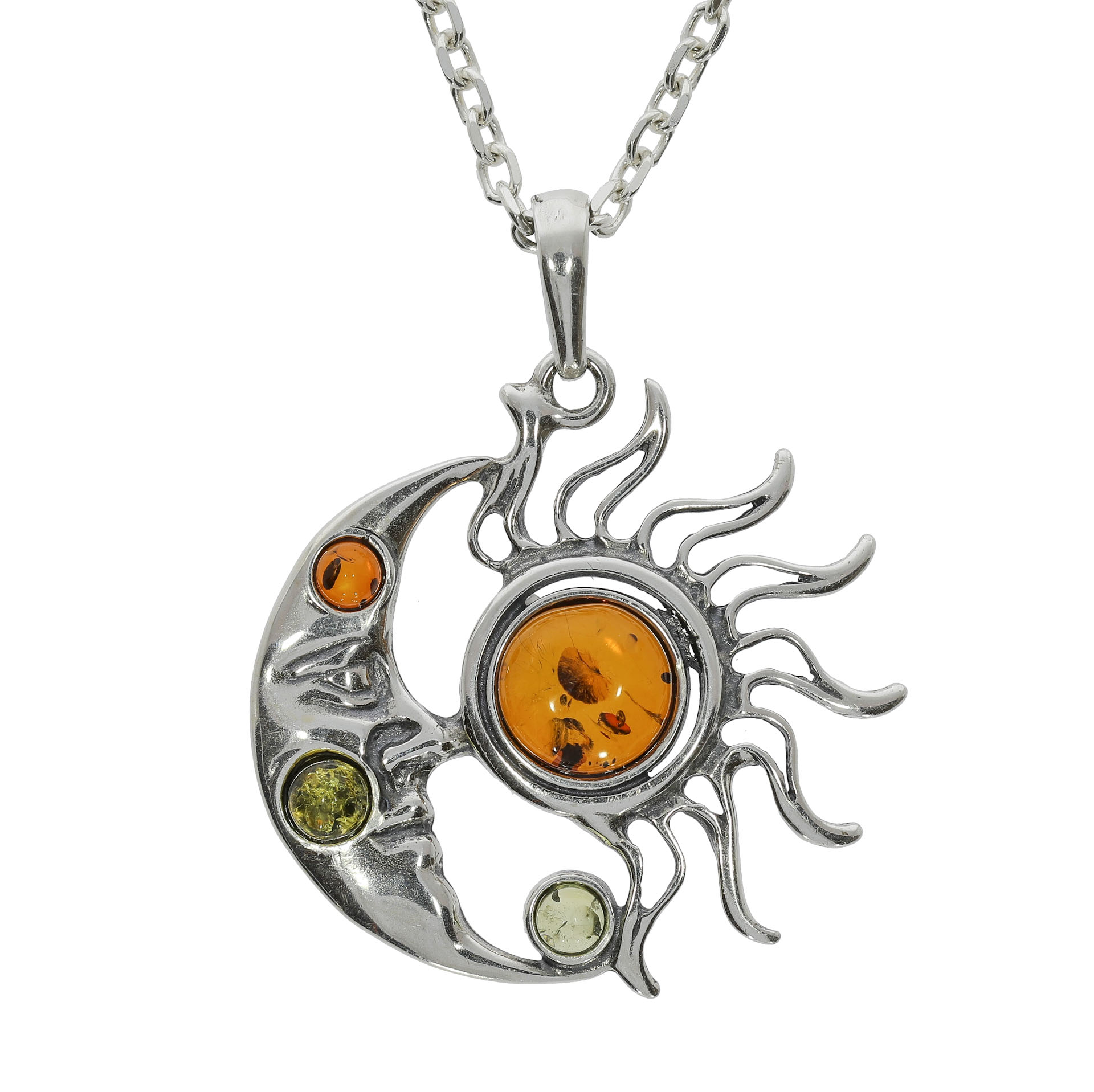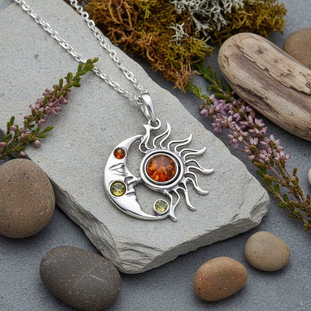 Himmelaksen – Sol og Måne Vedhæng i Sølv med Baltisk Rav